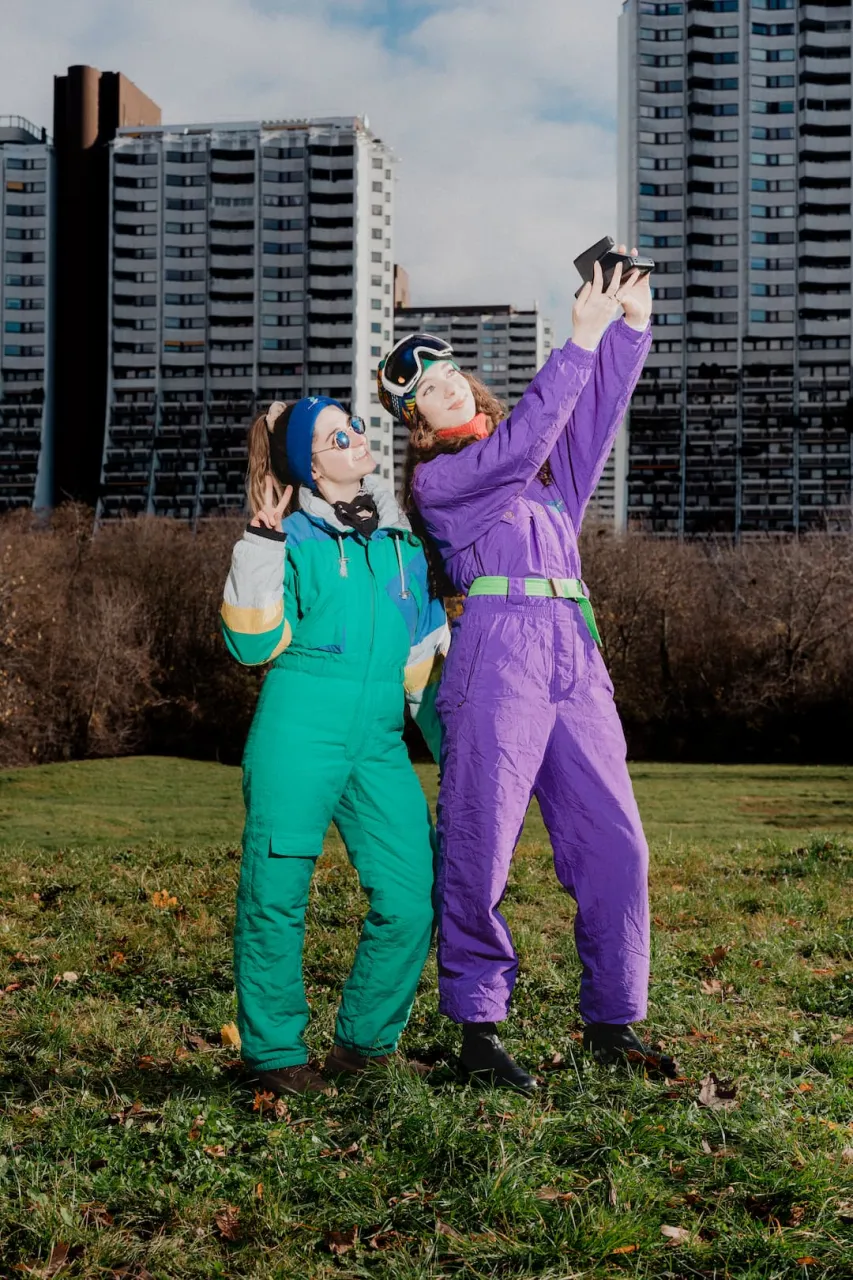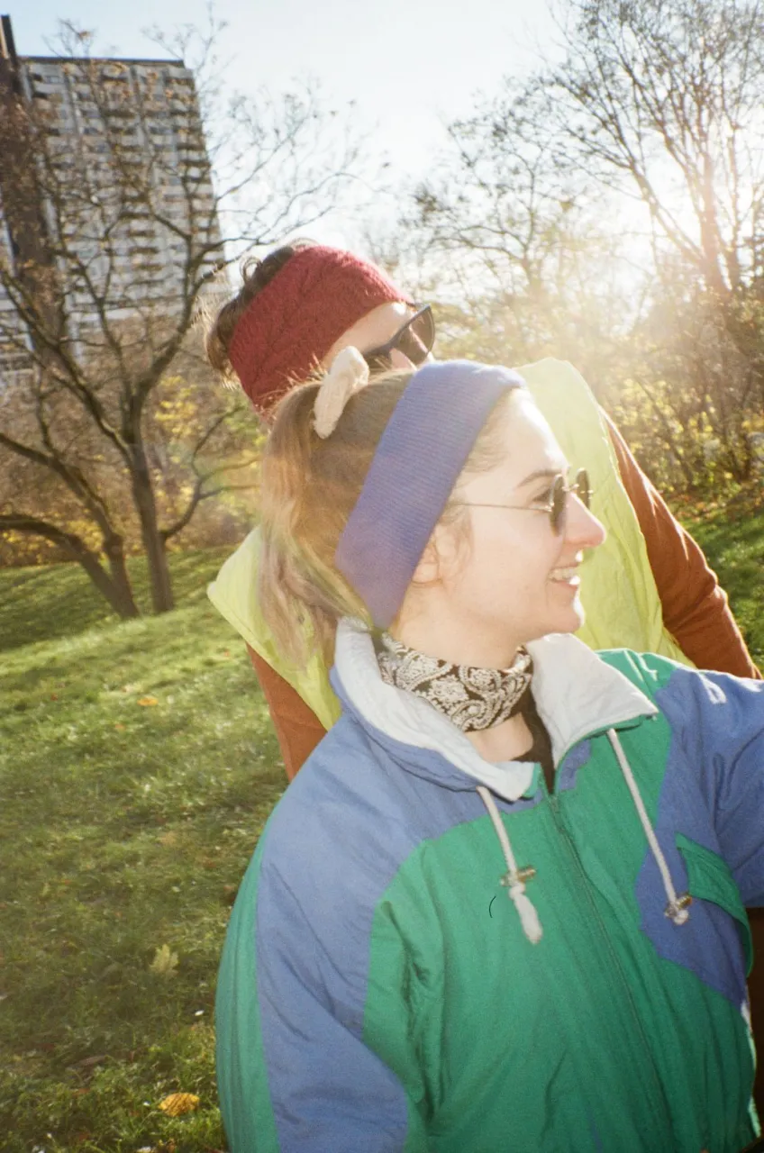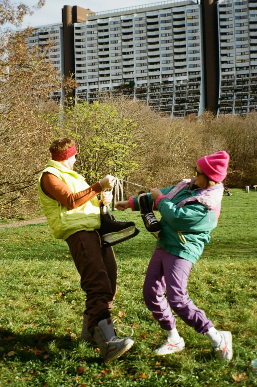 Lowfidelity Team in Vintage Kleidung auf einer grünen Wiese vor Alterlaa. Über den Personen steht Besinnliche, weiße Weihnacht.